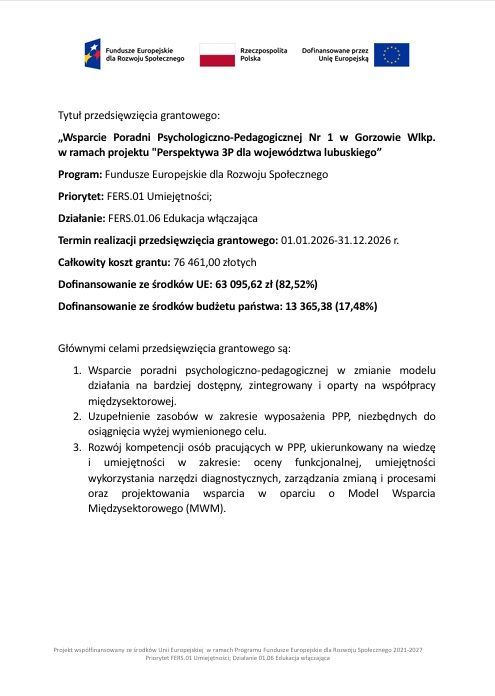 „Wsparcie Poradni Psychologiczno-Pedagogicznej Nr 1 w Gorzowie Wlkp. w ramach projektu "Perspektywa 3P dla województwa lubuskiego”